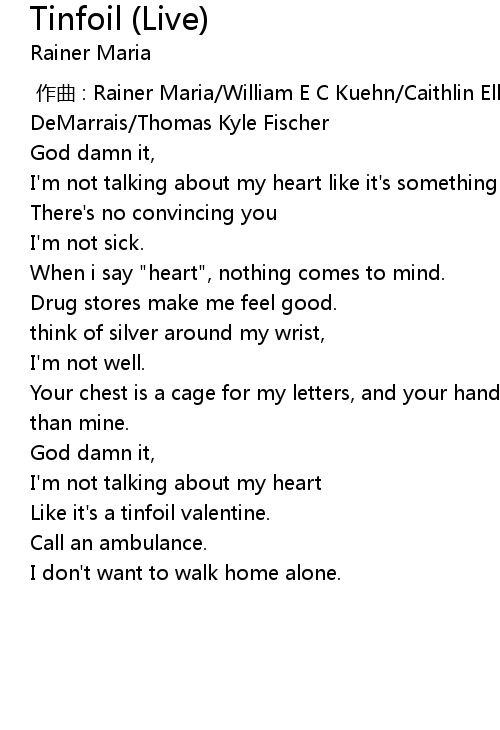 | [00:00.000] | zuò qǔ : Rainer Maria William E C Kuehn Caithlin Ellen DeMarrais Thomas Kyle Fischer |