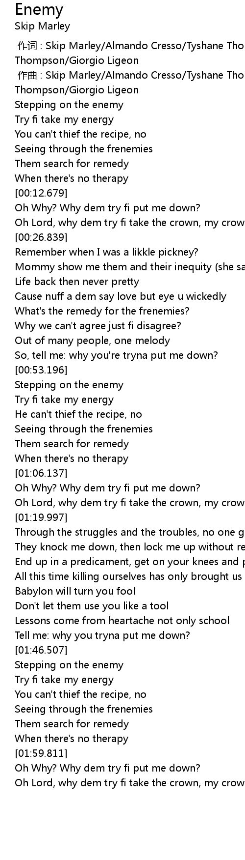 | [00:00.000] | 作词 : Skip Marley/Almando Cresso/Tyshane Thompson/Tasan Thompson/Giorgio Ligeon |