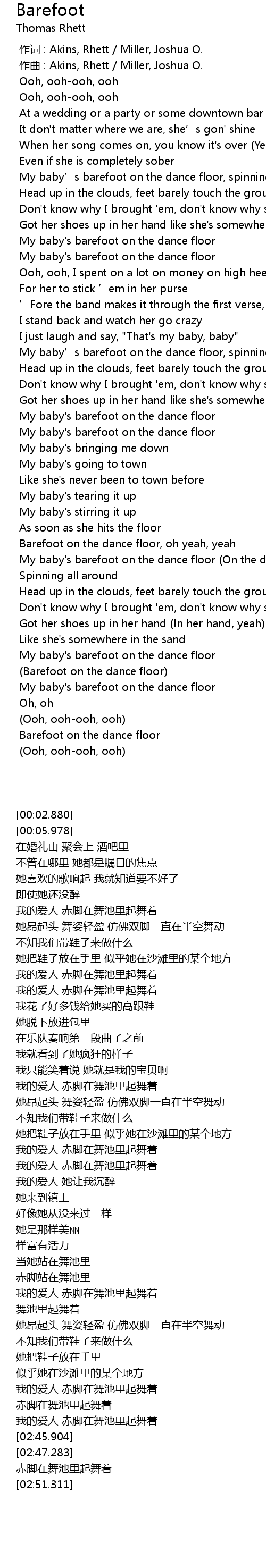| [00:48.569] | My baby' s barefoot on the dance floor |