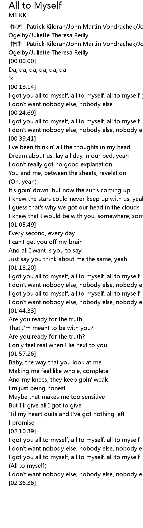| [02:10.38] | I got you all to myself, all to myself, all to myself |