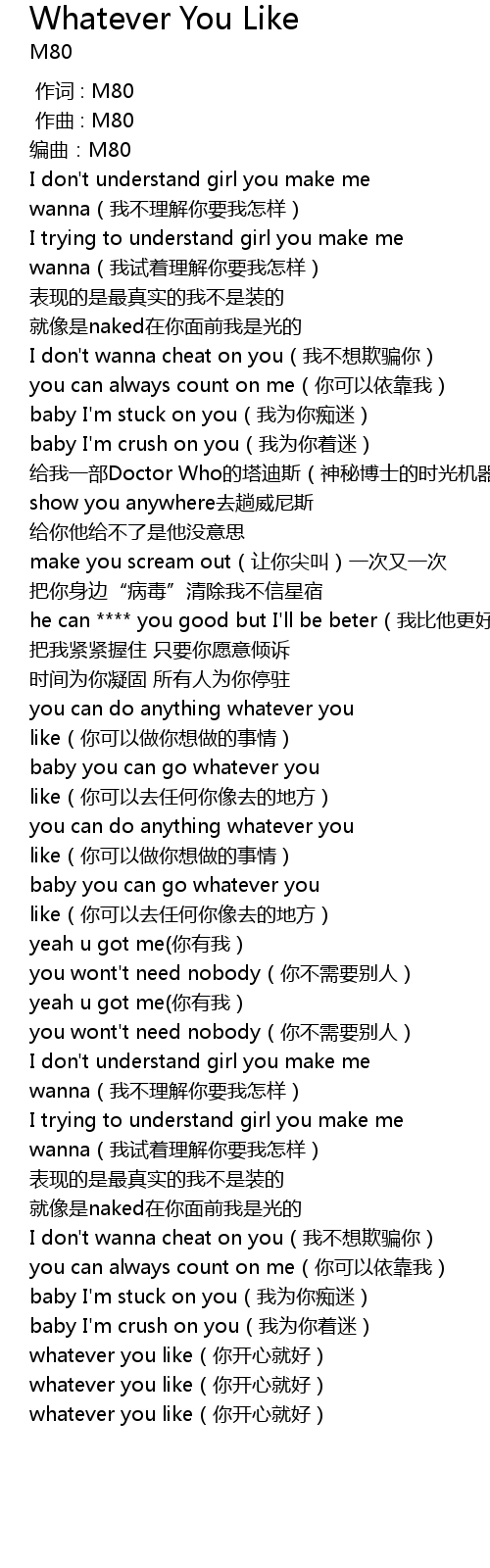 | [01:43.41] | I trying to understand girl you make me wanna wo shi zhe li jie ni yao wo zen yang |
