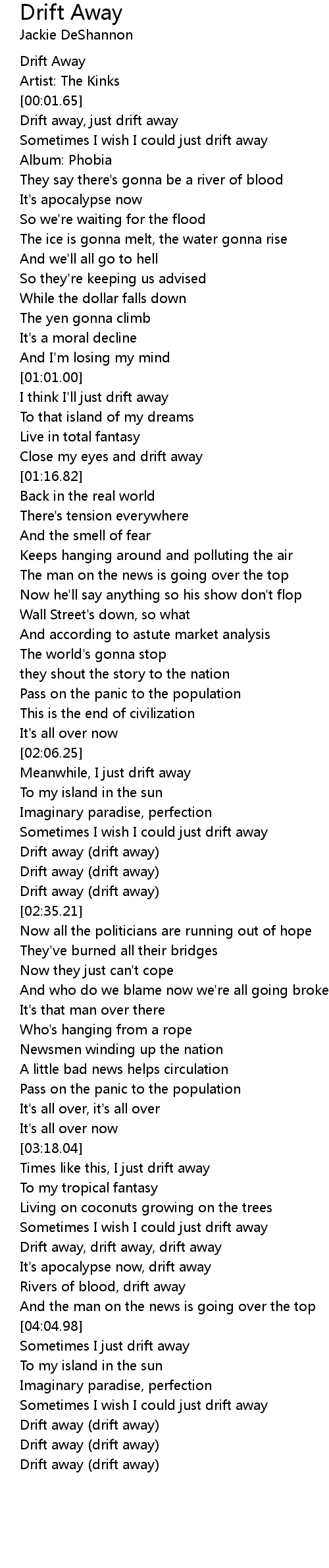 Drift away, drift away, drift away |