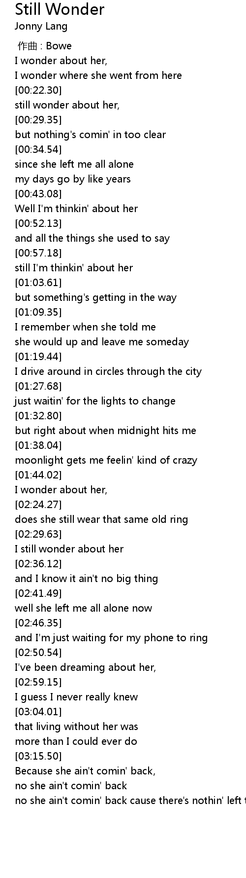 | [03:22.67] | no she ain't comin' back cause there's nothin' left to come back to |