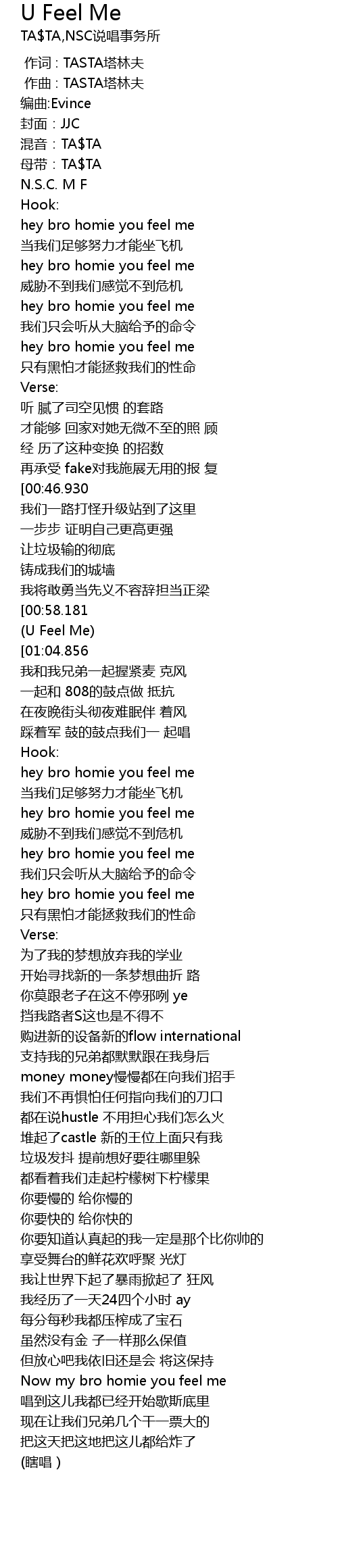 | [02:22.103] | Now my bro homie you feel me |