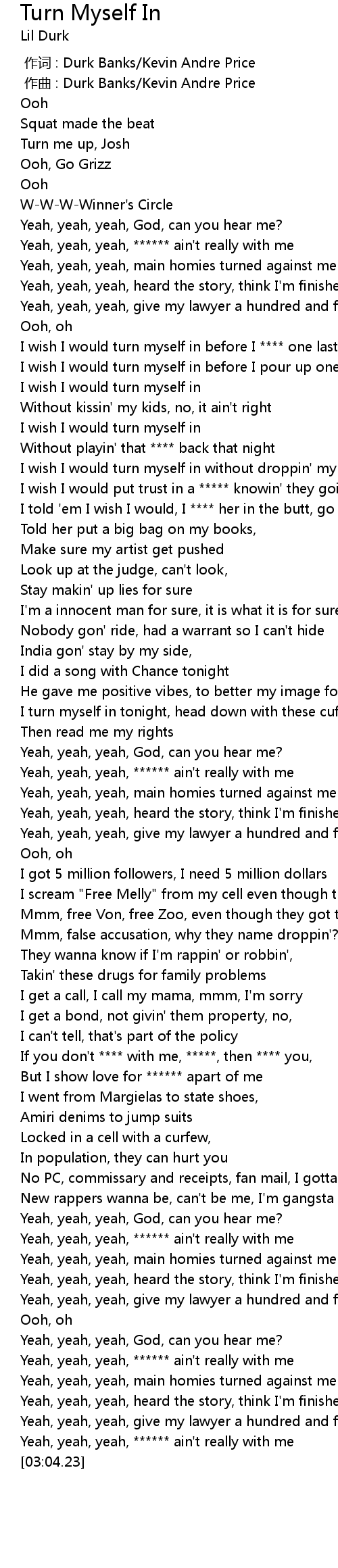 | [00:33.46] | I wish I would turn myself in before I **** one last time |