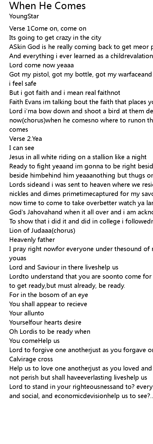 Lord i'ma bow down and shoot a bird at them devils cause its onnowit's on now(chorus)when he comesno where to runon that day,the world gonna paywhen he comes |