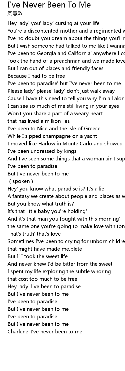 | [03:41.530] | CharleneI' ve never been to me |