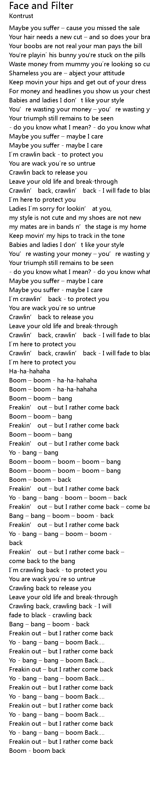 | Crawlin’ back, crawlin’ back - I will fade to black – crawlin’ back | |