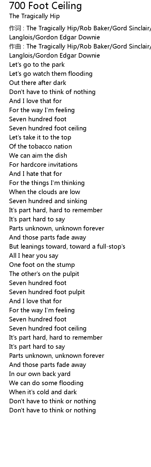 | 作词 : The Tragically Hip/Rob Baker/Gord Sinclair/Johnny Fay/Paul Langlois/Gordon Edgar Downie | |