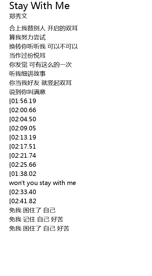 | [01:29.75][01:38.02][02:28.91][02:37.20][03:17.40][03:25.51][03:34.17][03:42.37] | Oh won' t you stay with me |