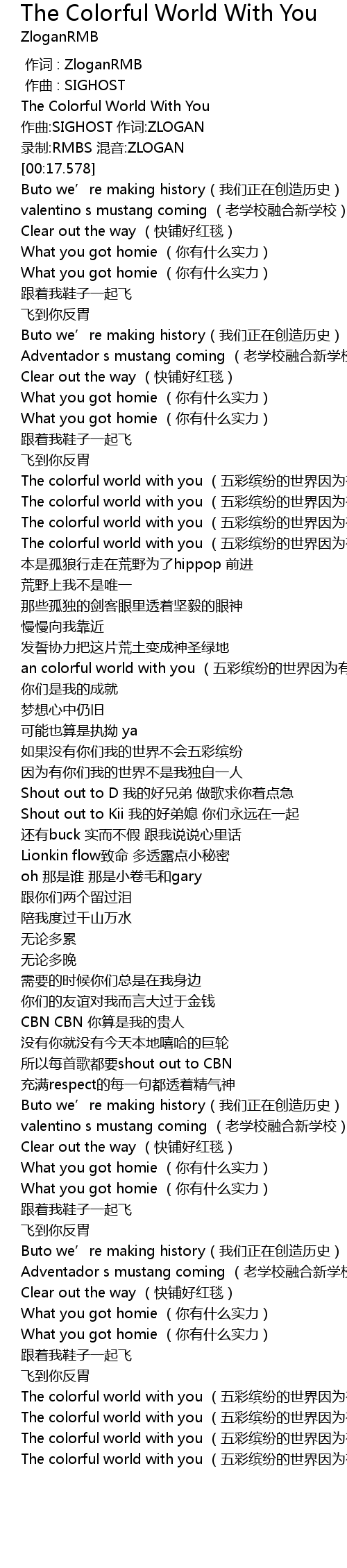 | [02:33.948] | The colorful world with you wǔ cǎi bīn fēn de shì jiè yīn wèi yǒu nǐ |