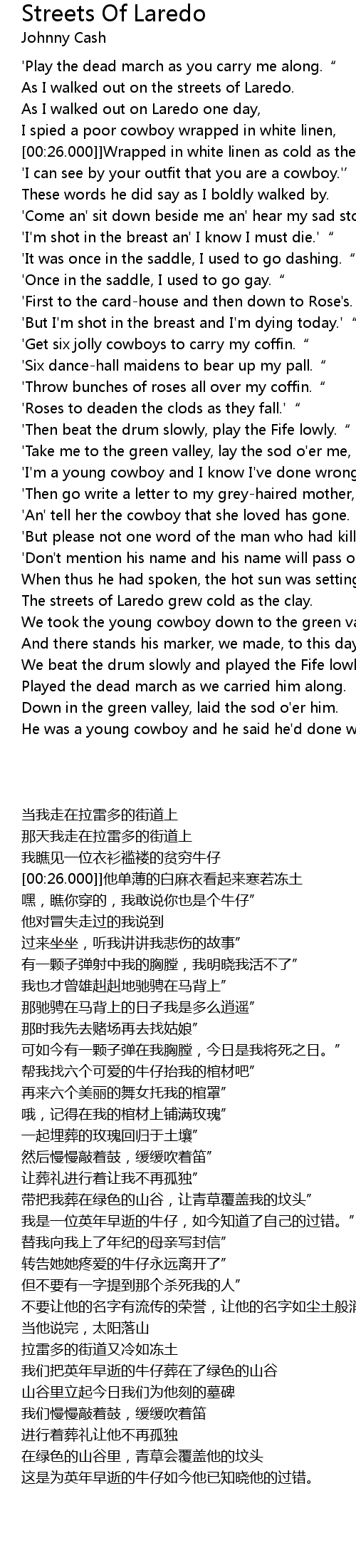 | [02:44.000] | The streets of Laredo grew cold as the clay. |
