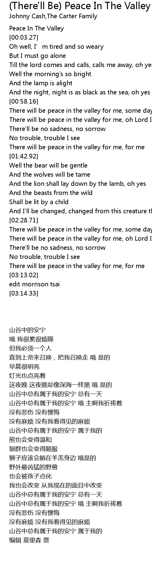 | [03:04.22] | There will be peace in the valley for me, for me |