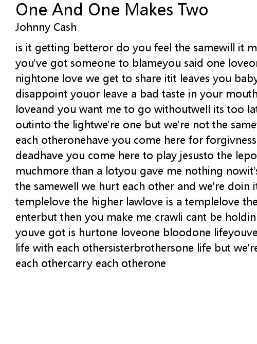 is it getting betteror do you feel the samewill it make it easier on you nowif you've got someone to blameyou said one loveone lifewhen it's one needin the nightone love we get to share itit leaves you baby if you dont care for itdid i disappoint youor leave a bad taste in your mouthyou act like you never had loveand you want me to go withoutwell its too latetonightto drag the past outinto the lightwe're one but we're not the samewe get to carry each othercarry each otheronehave you come here for forgivnesshave you come to raise the deadhave you come here to play jesusto the lepors in your headdid i ask too muchmore than a lotyou gave me nothing nowit's all i gotwe're one but we're not the samewell we hurt each other and we're doin it againyou said love is a templelove the higher lawlove is a templelove the higher lawyou ask me to enterbut then you make me crawli cant be holdin onto what youve gotwhen all youve got is hurtone loveone bloodone lifeyouve got to do what you shouldone life with each othersisterbrothersone life but we're not the samewe get to carry each othercarry each otherone |