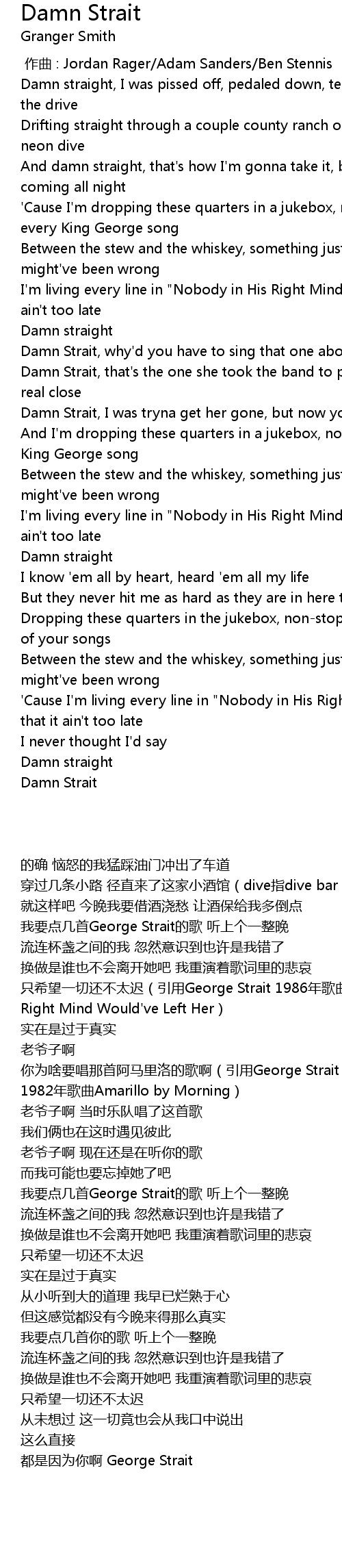 | [01:00.410] | Damn Strait, that' s the one she took the band to play and we danced real close |