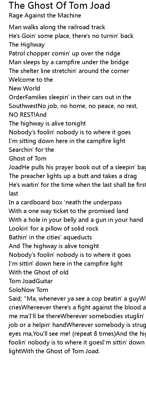Said; "Ma, whenever ya see a cop beatin' a guyWherever a hungry new born baby criesWhereever there's a fight against the blood and hatred in the airLook for me ma'I'll be thereWherever somebodies stuglin' for a place to standFor a decent job or a helpin' handWherever somebody is strugglin' to be freeLook in their eyes ma,You'll see me! (repeat 8 times)And the highway is alive tonightnobody's foolin' nobody is to where it goesI'm sittin' down here in the campfire lightWith the Ghost of Tom Joad. |