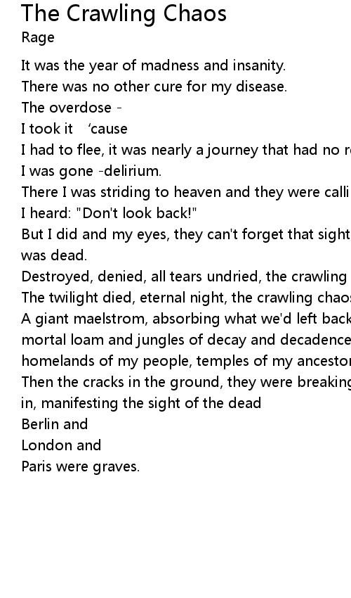 | Destroyed, denied, all tears undried, the crawling chaos comes. | |