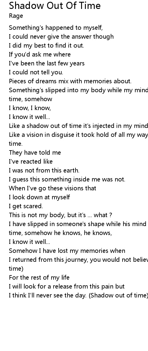 Like a shadow out of time it's injected in my mind, like a shadow out of time. |