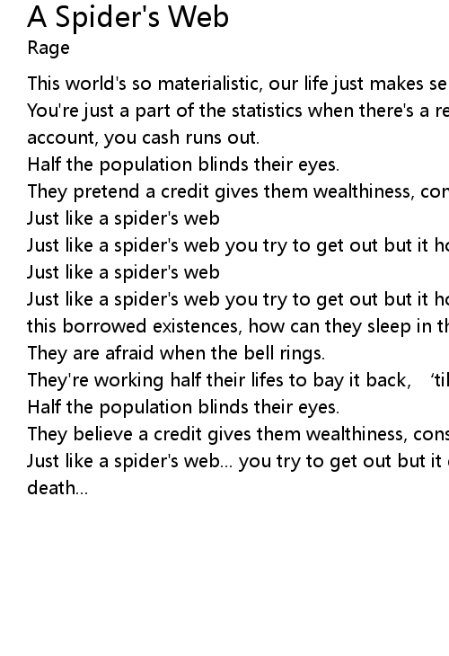 | Just like a spider's web you try to get out but it holds you tight like all of this borrowed existences, how can they sleep in the night. | |