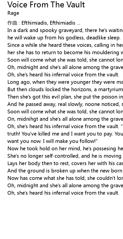 | Oh, she' s heard his infernal voice from the vault. " The truth, give me the truth! You' ve killed me and I want you to pay. You' ve promised to be mine and I want you now. I will make you follow!" | |