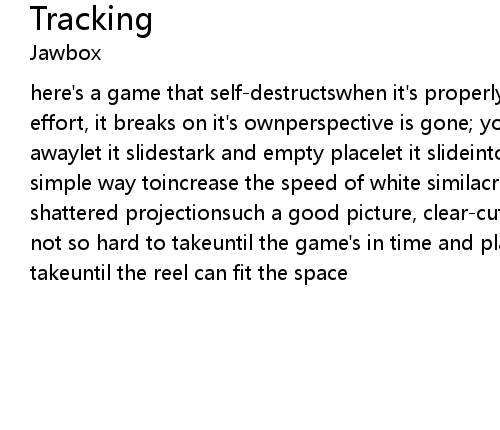 | here's a game that self-destructswhen it's properly set into motionsaves you the effort, it breaks on it's ownperspective is gone; you're watching it sliding awaylet it slidestark and empty placelet it slideinto regained spacehere's a simple way toincrease the speed of white similacrumforce-feed the reel onto shattered projectionsuch a good picture, clear-cut tracking this timeand this is not so hard to takeuntil the game's in time and placeand this is not so hard to takeuntil the reel can fit the space |