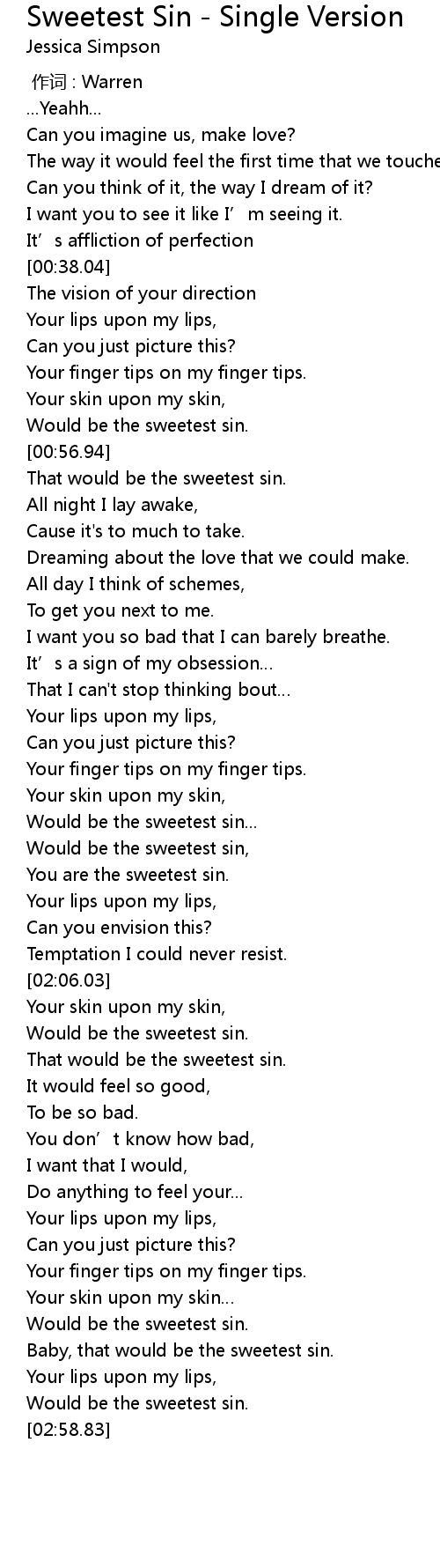 | [02:47.66] | Baby, that would be the sweetest sin. |