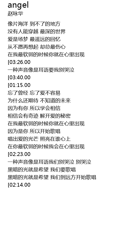 | [03:55.00][03:26.00][02:16.00][00:53.00] | Yeliel My Angel chen mo kai shi ting jian |