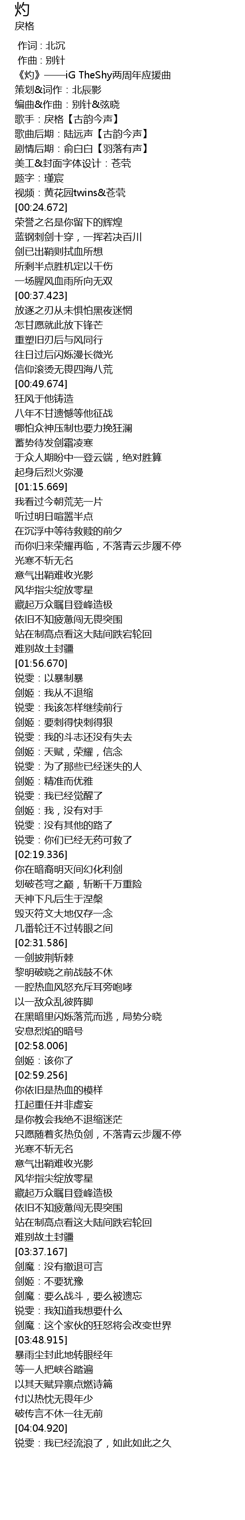 | [00:00.421] | 《灼》——iG TheShy两周年应援曲 |