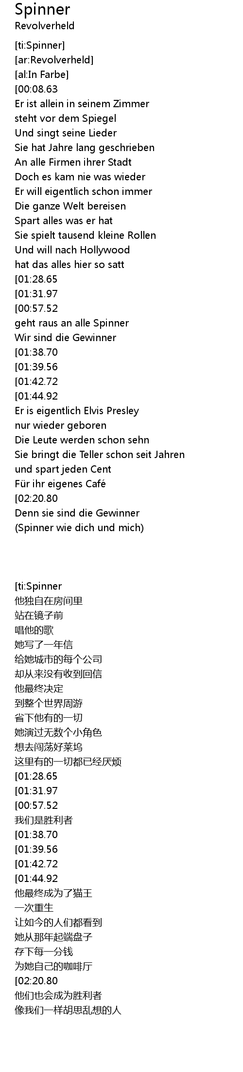 | [01:01.18][01:44.92][01:57.26][02:28.45][02:41.70] | Ohne Spinner wie dich und mich |