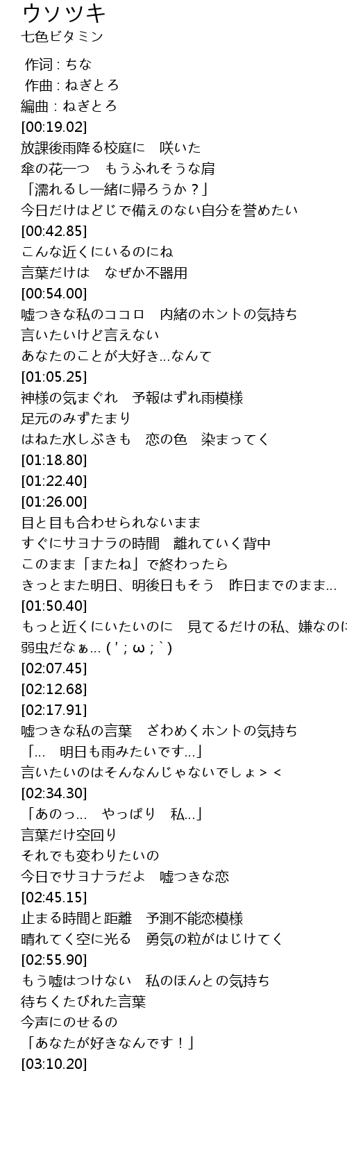 | [02:56.00] | もう嘘はつけない 私のほんとの気持ち |