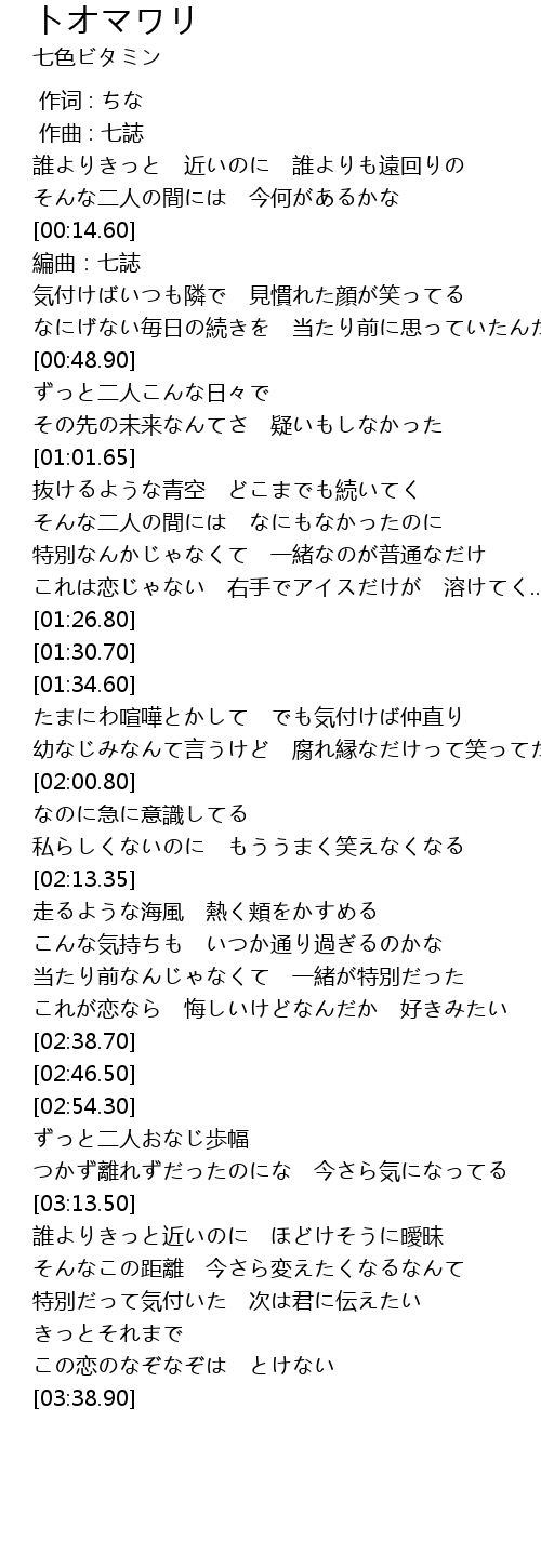 | [03:02.25] | ずっと二人おなじ歩幅 |