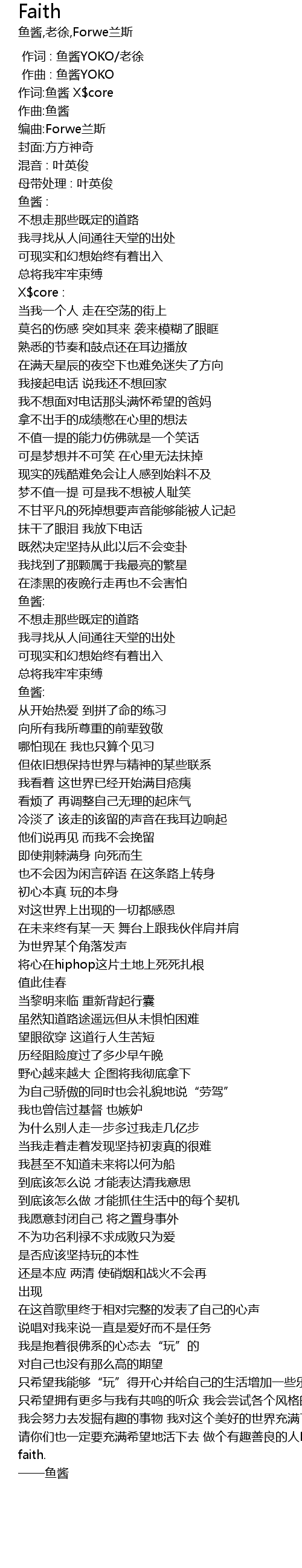 | [02:55.68] | 在这首歌里终于相对完整的发表了自己的心声 说唱对我来说一直是爱好而不是任务 我是抱着很佛系的心态去“玩”的 对自己也没有那么高的期望 只希望我能够“玩”得开心并给自己的生活增加一些乐趣 只希望拥有更多与我有共鸣的听众 我会尝试各个风格的作品 我会努力去发掘有趣的事物 我对这个美好的世界充满了好奇 请你们也一定要充满希望地活下去 做个有趣善良的人Full of faith. |