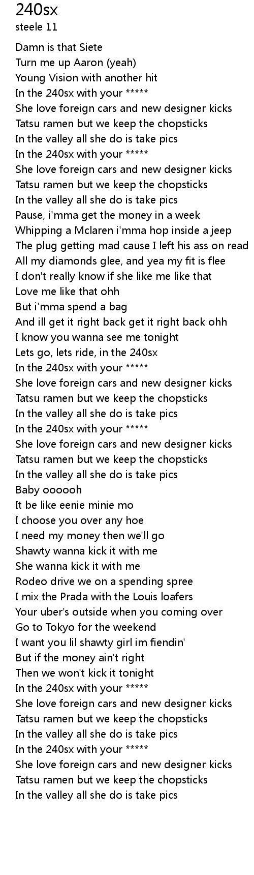 | [01:14.66] | Lets go, lets ride, in the 240sx |