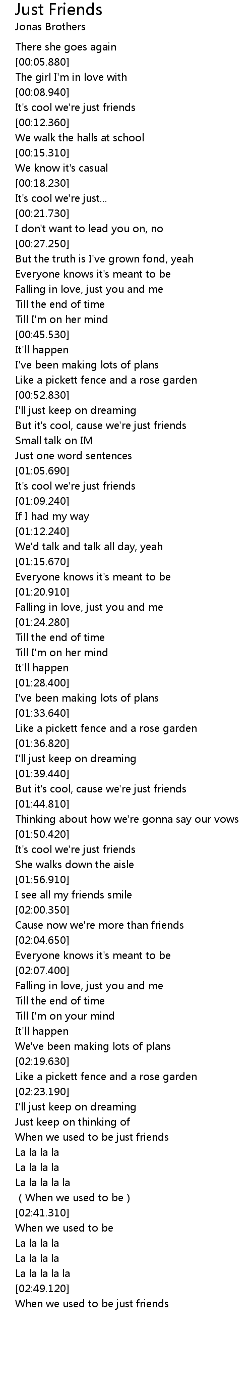 | [00:10.370] | It' s cool we' re just friends |