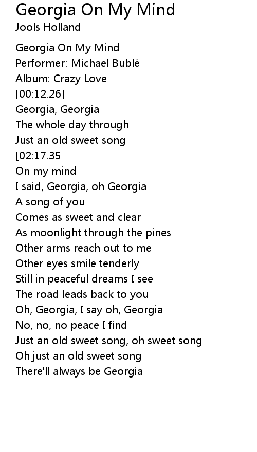 | [02:32.07][02:17.35][00:38.17] | Keeps Georgia on my mind |