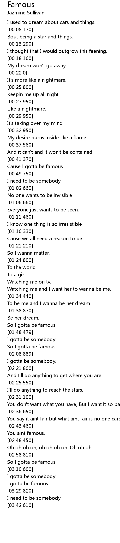 | [02:37.590] | You say it aint fair but what aint fair is no one cares if you aint famous. |