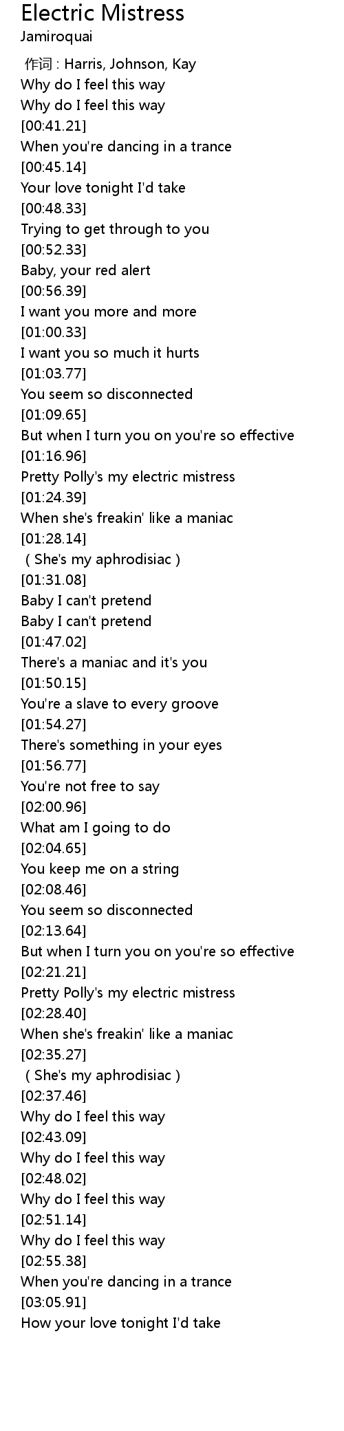 | [02:26.83] | Pretty Polly's my electric mistress |
