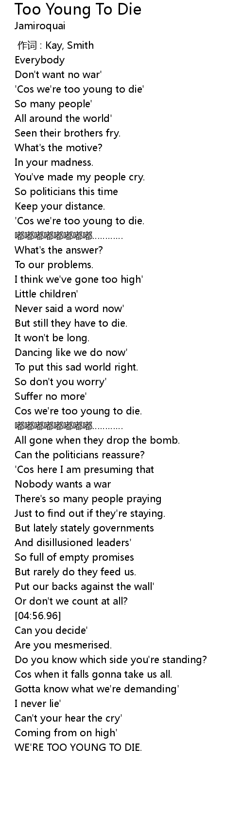 | [00:29.76] | ' Cos we' re too young to die' |