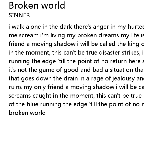 i walk alone in the dark there's anger in my hurted heart no one will ever hear me scream i'm living my broken dreams my life is turning into ruins my only friend a moving shadow i will be called the king of fools silent screams caught in the moment, this can't be true disaster strikes, it came out of the blue running the edge 'till the point of no return here and forever - my broken world it's not the game of good and bad a situation that drives me mad i'm on the road that goes down the drain in a rage of jealousy and pain my life is turning into ruins my only friend a moving shadow i will be called the king of fools silent screams caught in the moment, this can't be true disaster strikes, it came out of the blue running the edge 'till the point of no return here and forever - my broken world |