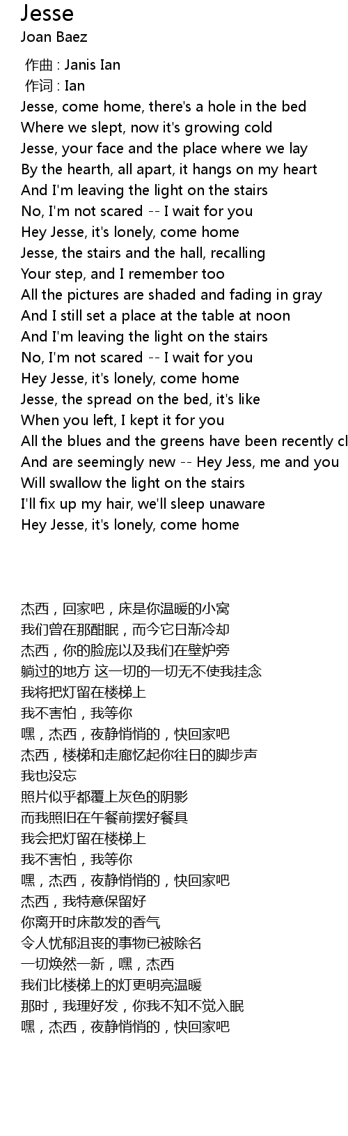 | [00:59.22] | Hey Jesse, it' s lonely, come home |