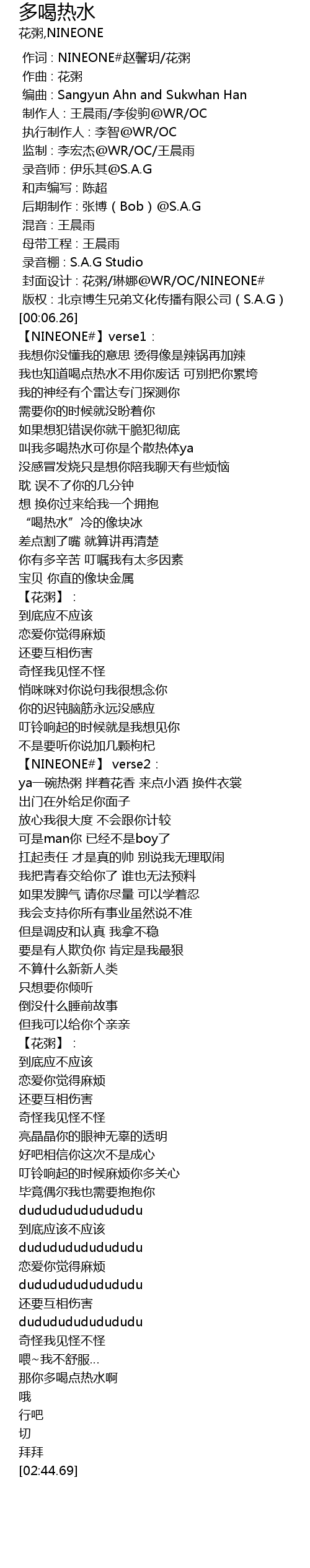 | [02:34.22] | nà nǐ duō hē diǎn rè shuǐ a |