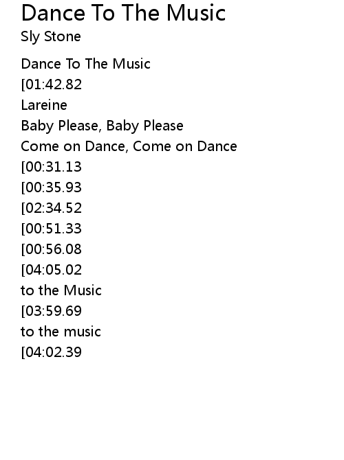 | [04:07.98][04:05.02][03:57.15][03:54.95][03:47.46][03:44.89][03:37.24][03:34.66][03:27.12][03:24.71][03:16.74][03:14.54][03:06.79][03:04.95][01:33.25][01:31.25][01:23.15][01:21.18][01:13.36][01:11.10] | Dance to the Music |