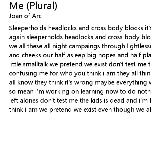 Sleeperholds headlocks and cross body blocks it's over / done and what are we again sleeperholds headlocks and cross body blocks it's over / done and what are we all these all night campaings through lightlessness but spinelight a blink and cheeks our half asleep big hopes and half plans mirrored nearly infinite a little smalltalk we pretend we exist don't test me the kids is dead and i'm left confusing me for who you think i am they all think they know it's wrong and they all know they think it's wrong maybe everything we meant to be di'nt need to end so mean i'm working on learning now to do nothing learning better leavings and left alones don't test me the kids is dead and i'm left confusing me for who you think i am we pretend we exist even though we all know the kids is dead |