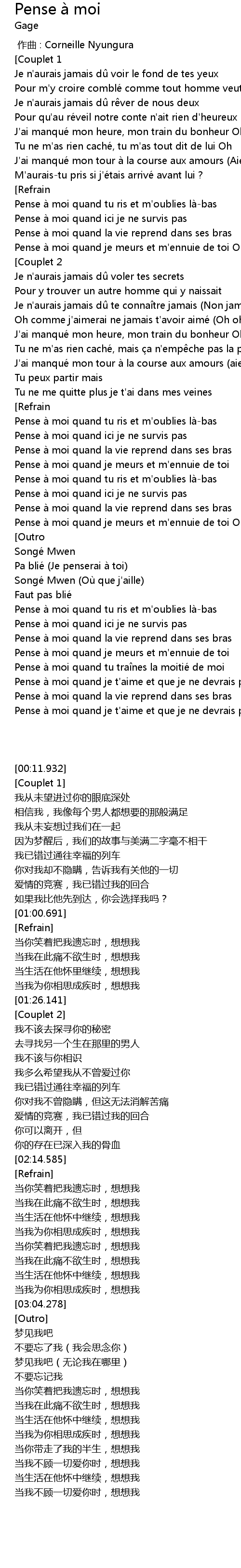 | [03:59.474] | Pense a moi quand je t' aime et que je ne devrais pas |