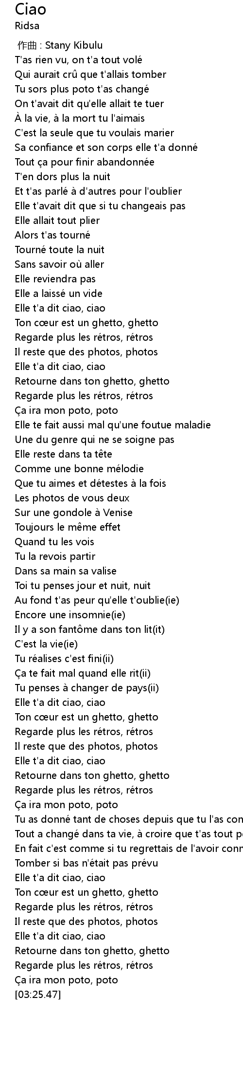 | [00:58.18] | Elle t'a dit ciao, ciao |