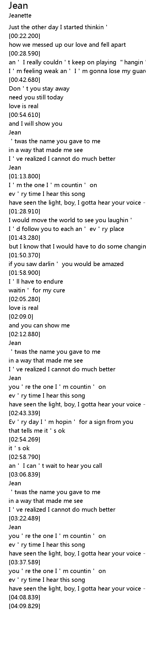 | [03:31.649] | have seen the light, boy, I gotta hear your voice Jean |