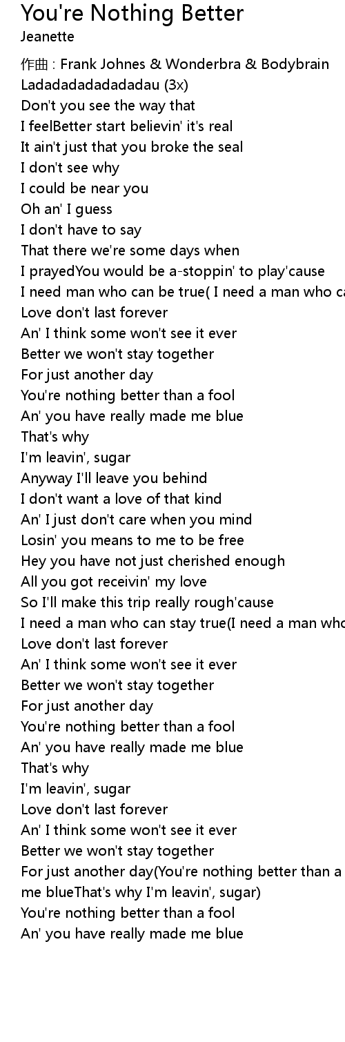 | For just another day(You're nothing better than a foolAn' you have really made me blueThat's why I'm leavin', sugar) | |