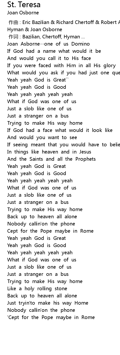 | [00:00.00] | 作曲 : Eric Bazilian & Richard Chertoff & Robert Andrew Hyman & Rob Hyman & Joan Osborne |