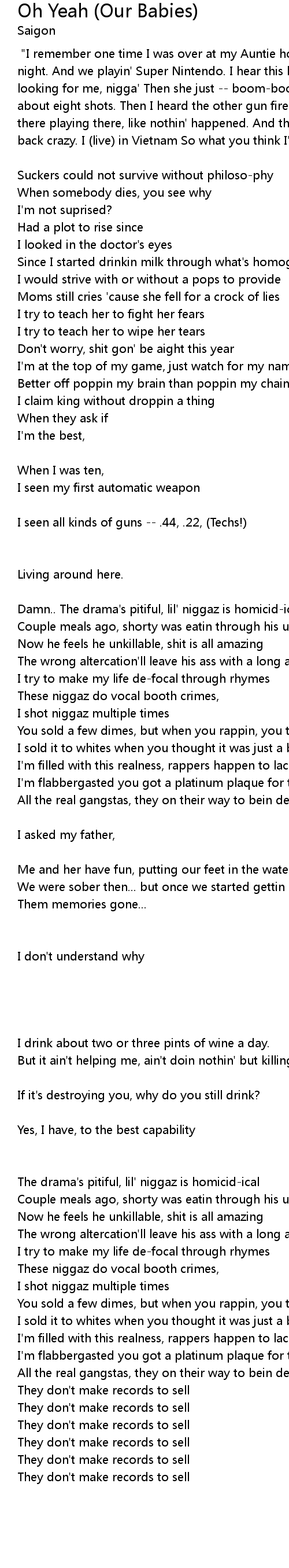 [LeAlan Jones] "I remember one time I was over at my Auntie house spending the night. And we playin' Super Nintendo. I hear this lady: 'Yo, I heard you been looking for me, nigga' Then she just -- boom-boom-boom-boom-boom! She let off about eight shots. Then I heard the other gun fire off and we were just still there playing there, like nothin' happened. And then Vietnam, them people came back crazy. I (live) in Vietnam So what you think I'ma be if I live in it and they just went and visited?" [Saigon] |