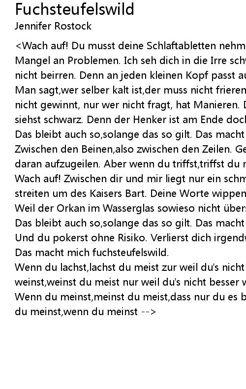 | Wach auf! Zwischen dir und mir liegt nur ein schmaler Grat. Wir diskutieren und streiten um des Kaisers Bart. Deine Worte wippen wie im Walzer immer auf und ab. Weil der Orkan im Wasserglas sowieso nicht überschwappt. | |